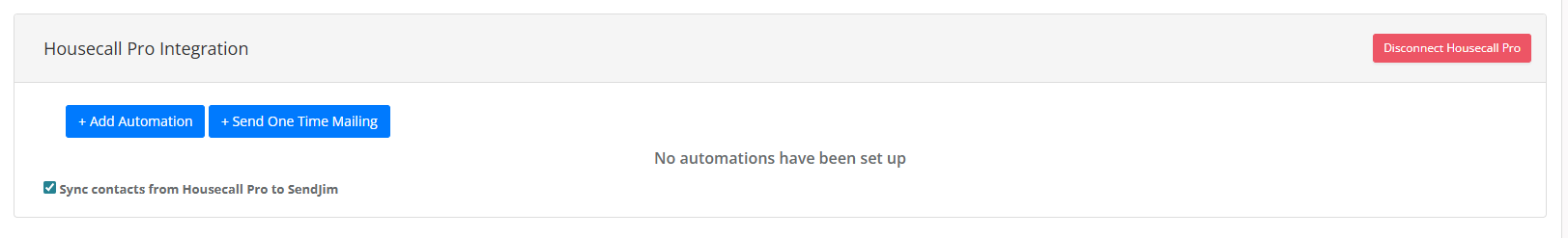 Step 3: Now you will see you are connected and can start setting up automation. You can also check the box if you want to sync contacts from Housecall Pro to SendJim. Contacts will sync from Housecall Pro to SendJim but not SendJim to Housecall Pro. Housecall Pro will only bring over one address per Customer Profile, it favors the Billing Address.