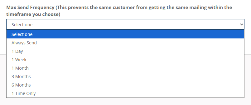 Step 5: The next step is to choose your Max Send Frequency Per Address. This setting will limit how many times the integration will trigger the same Campaign off the same address. For example, if you have an automation set-up to send a 3-card Campaign to the neighbors after a job is completed, you only want that Campaign to trigger once every 3 months if you service that client multiple times per month. This would prevent the neighbors of your client from receiving multiple of the same mailing.
