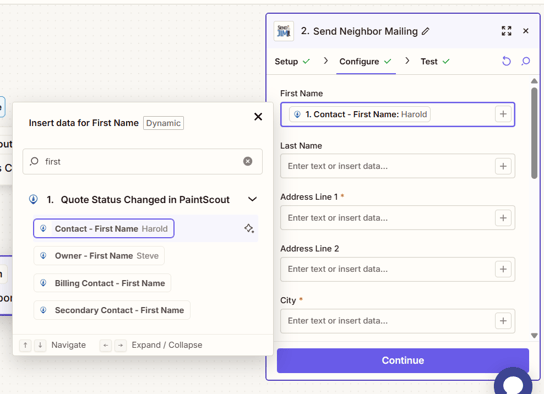 - Click the + in the First Name box. It will then bring up the information being brought over by the Trigger step. Either use the Search box at the top to find the First Name field or scroll until you locate it. Then just click that field.