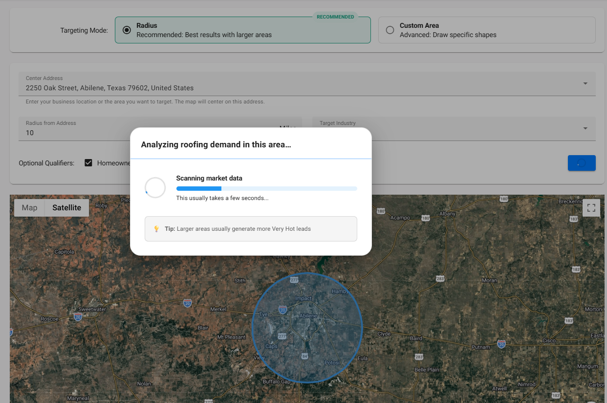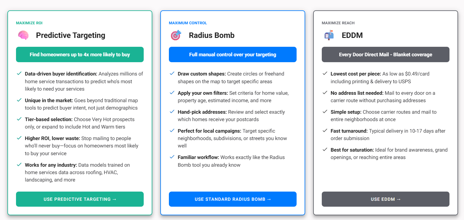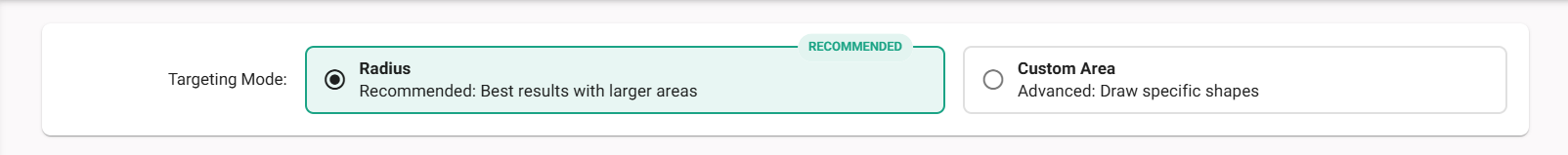 - Targeting Mode: You will have the option to target based off a Radius (mile distance around the address you add) or to draw a Custom Area (just like in the Radius Bomb).